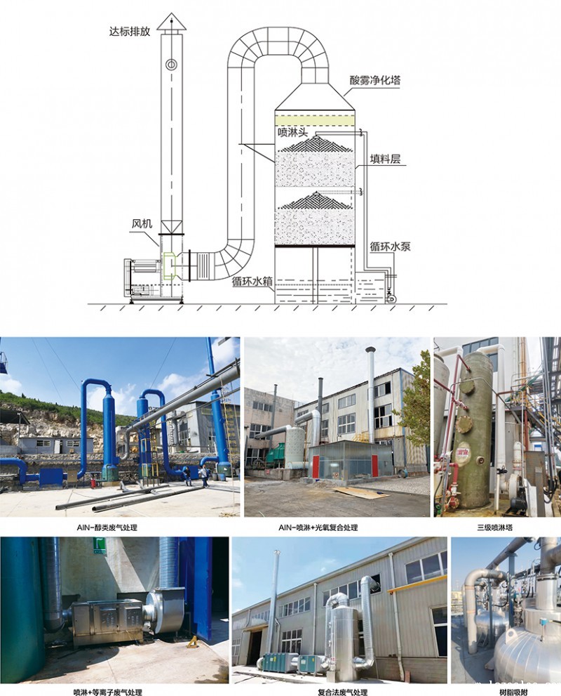 废气净化喷淋塔主要的运作方式是废气由风管引入净化塔,经过填料层,废气与氢氧化钠吸收液进行气液两相充分接触吸收中和反应,废气经过净化后,再经除雾板脱水除雾后由风机排入大气。吸收液在塔底经水泵增压后在塔顶喷淋而下,回流至塔底循环使用。净化后的废气达到地方排放标准的排放要求,低于国家排放标准。